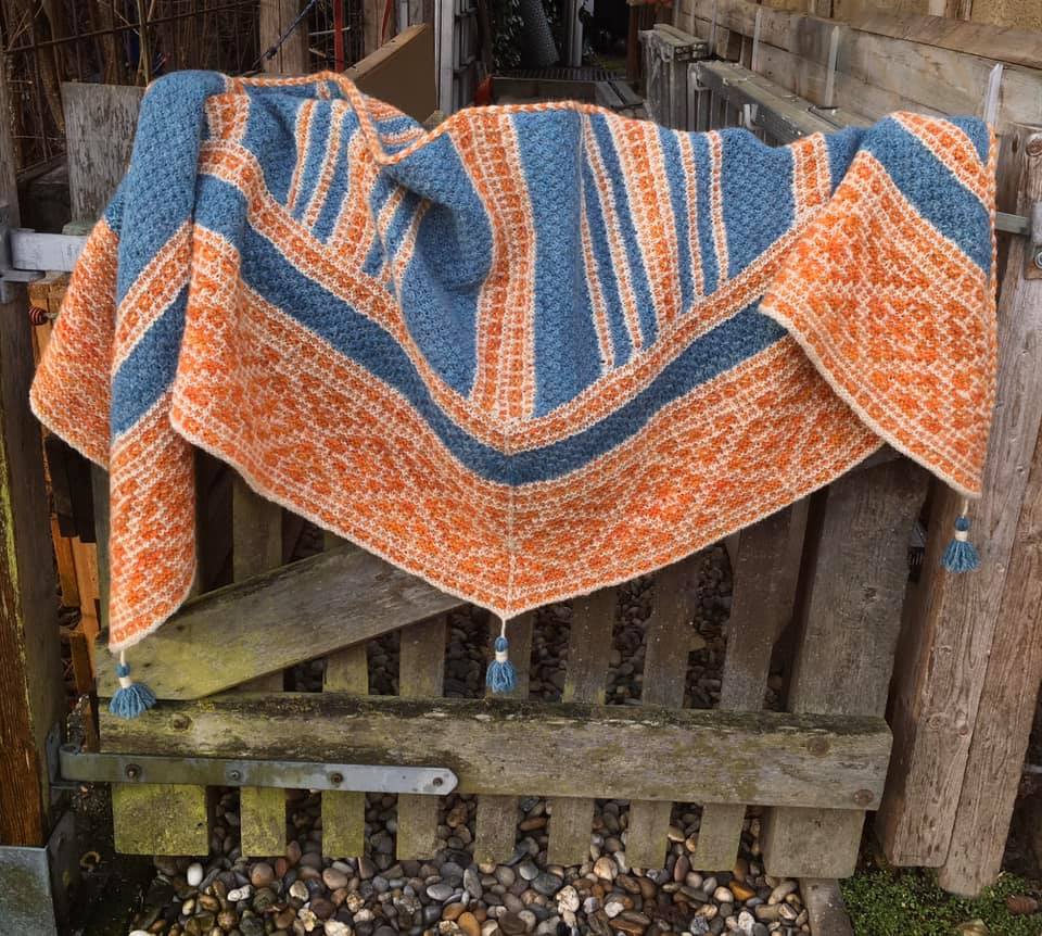 Lunae (Design Natasja Hornby) aus der Wolle von Coburger Fuchs Schafen und Mixen, ursprüngliche Landschafe mit einer warm-beigen Wolle. Die Herde ist der Umgebung von Wiesbaden in Sachen Landschaftspflege unterwegs. Die Wolle habe ich passend für dieses Projekt gefärbt. Sehr besonders….. viel Arbeit…. Es ist schon vergeben.
