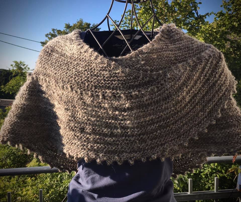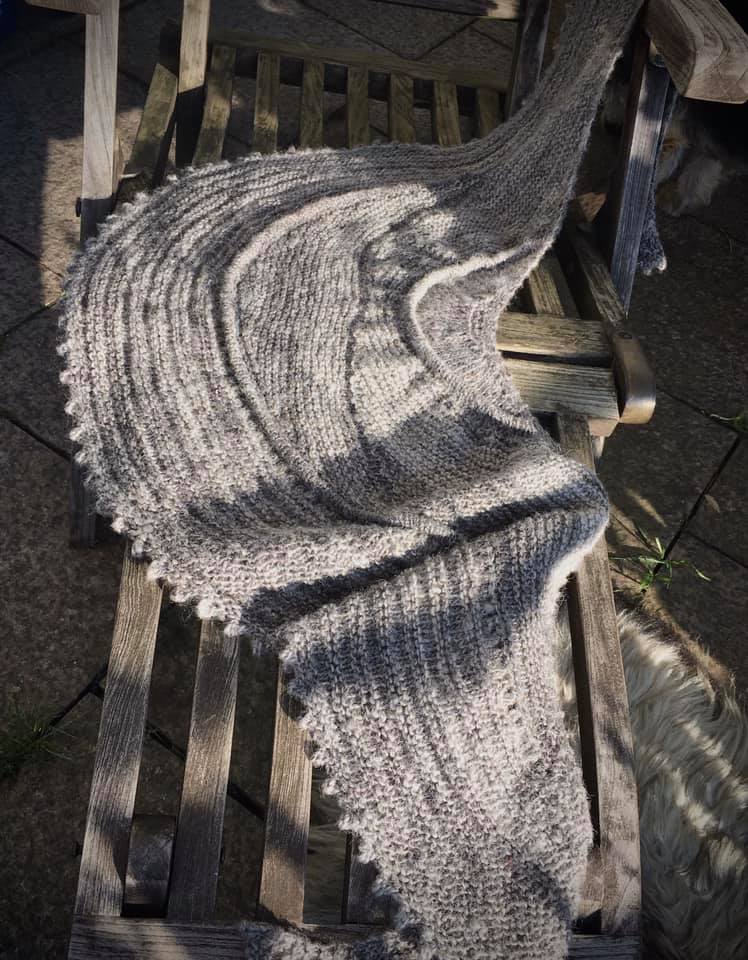 Iberian Discovery (Design Westknits). Handgestrickt aus der Wolle eines Black Welsh Mountain x Rhön-Schafs. Hellere und dunklere Grauschattierungen – Naturton – machen dieses Tuch sehr reizvoll und besonders. – 150 €