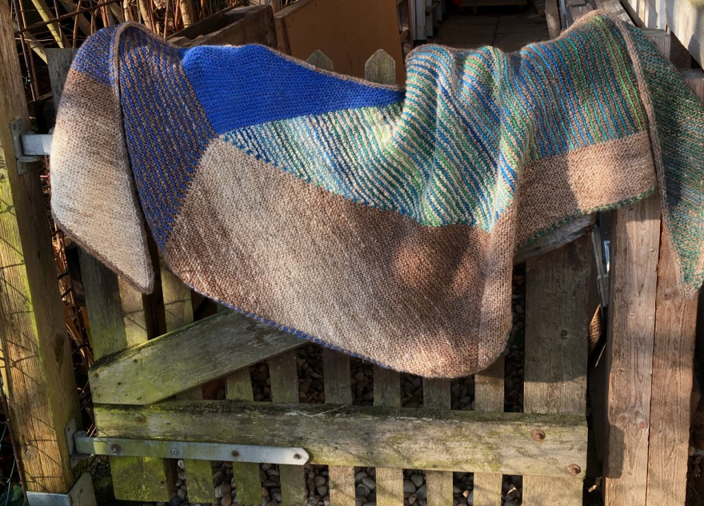 Vertices Unite (Design Westknits) aus der Wolle eines gescheckten Bergschafs von einer Schäferin an der Ostsee und blau-grün-türkis gefärbter Wolle vom Merino-Landschaf. Wasser- und Naturfarben sind zusammen einzigartig schön. – 180 €