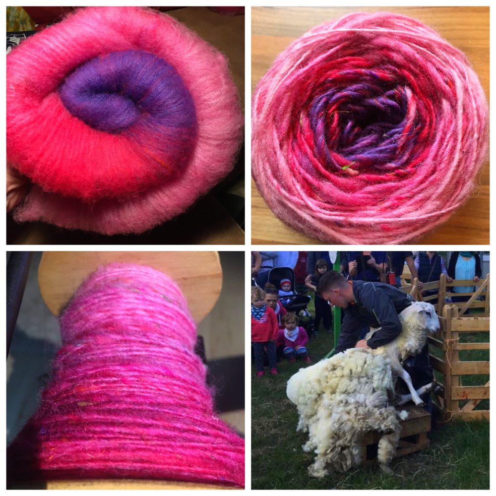 Vertices Unite (Design Westknits) aus handgesponnener und handgefärbter Wolle. Wollspender war ein Texel x Milschaf; die erste Schur auf dem Schafmarkt in Lensahn an der Ostsee. Bei der ersten Schur ist die Wolle immer besonders weich. Kleine Akzente aus Sariseide machen das Garn besonders reizvoll. – 180 €