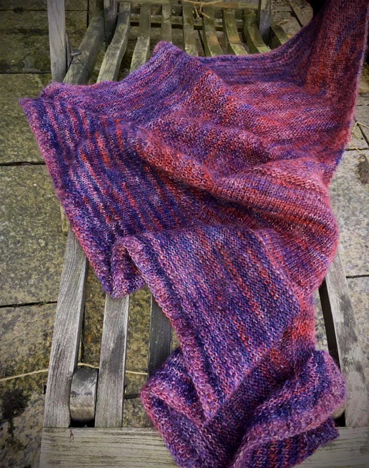 Blue Whale (Westknits) aus der Wolle vom Gotländischen Pelzschaf, handgesponnen + -gefärbt. Habtik ähnlich wie Mohair. ca. 1,70 m und 230 g leicht. Legt sich rund sehr gut um die Schultern. 150 € inkl. Porto in Deutschland.