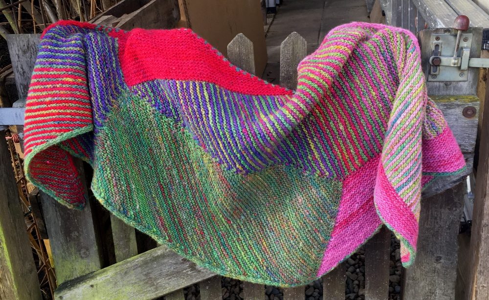 Vertices Unite (Design Westknits) aus handgesponnener und handgefärbter Wolle. Wollspender war ein Texel x Milschaf; die erste Schur auf dem Schafmarkt in Lensahn an der Ostsee. Bei der ersten Schur ist die Wolle immer besonders weich. Kleine Akzente aus Sariseide machen das Garn besonders reizvoll. – 180 €