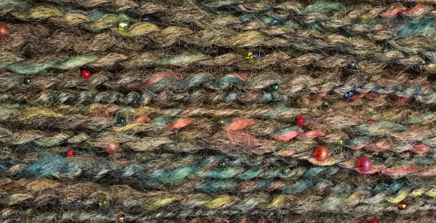 Ich finde den Kontrast zu dem eher rustikalen Garn irgendwie nett. + die Perlen sind wirklich sehr klein, deshalb fallen sie nicht so auf.