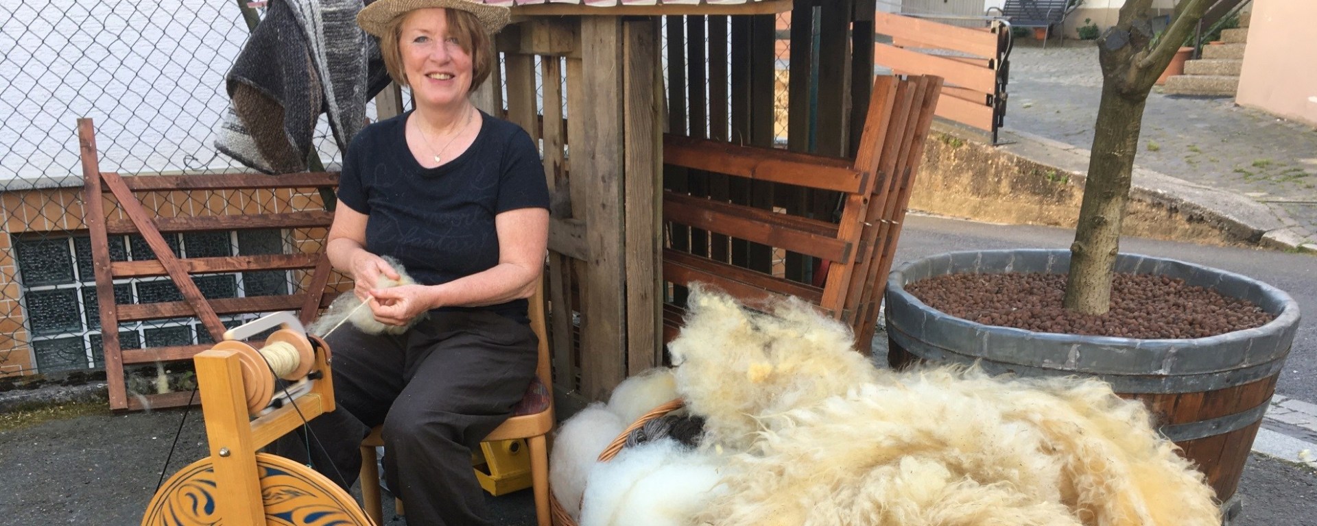 Gestern haben 4 Rhönschafe vom Weingut Klepper ihre Wolle gelassen. Es wurde Zeit! Gerne hatte ich mich bereit gefunden, dort eine kleine Spinnvorführung zu machen. Also war ich mit meinem Louet S10 zur Stelle, nahm immer gleich die noch warmen Wollvliese in Empfang und begann, direkt aus der Flocke zu spinnen. Das ging sogar recht gut. Meine Hände waren dann sehr Lanolin-gepflegt. Viele Eltern und Großeltern waren mit Kindern dort, und haben sich sehr gefreut, so ein kleines Stück Landleben und Handwerkskunst mitzuerleben. Ungefähr die Hälfte der Wolle wurde von mir für gut und spinnfähig befunden. Das ist der kleine Berg neben mir. Die nächste Spinnaktion ist dann am Pfingstsonntag beim Almauftrieb der Schafe in Niedergladbach.