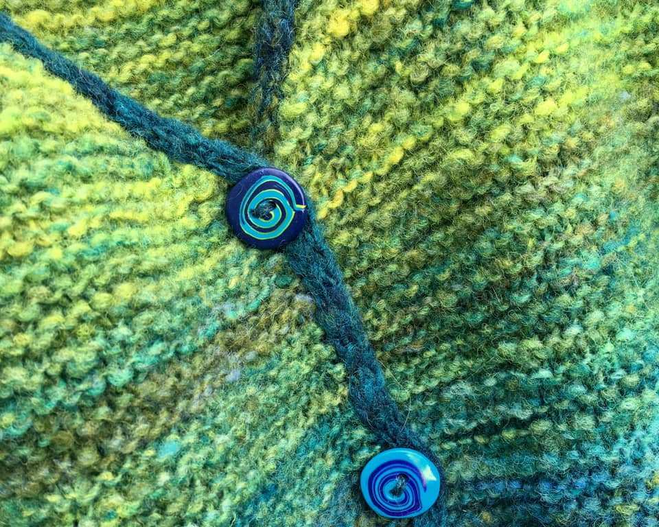 Gut abgelagert war dieses unvollendete Projekt. Es fehlte die passende Idee für den Abschluß, die Ärmellänge…. dann ein heißer Sommer….. aber nun war es soweit. Der Abschluß mit einem Icord. Die Ärmel auf halbe Länge begrenzt, weil ich lange Ärmel eh immer hochschoppe. Meine selfmade Fibu-Knöpfe passen auch ganz hervorragend. – Die Wolle stammt von süddeutschen Schafen. Gefärbt und so feinen Batts kardiert hat sie Sanne Hecht.