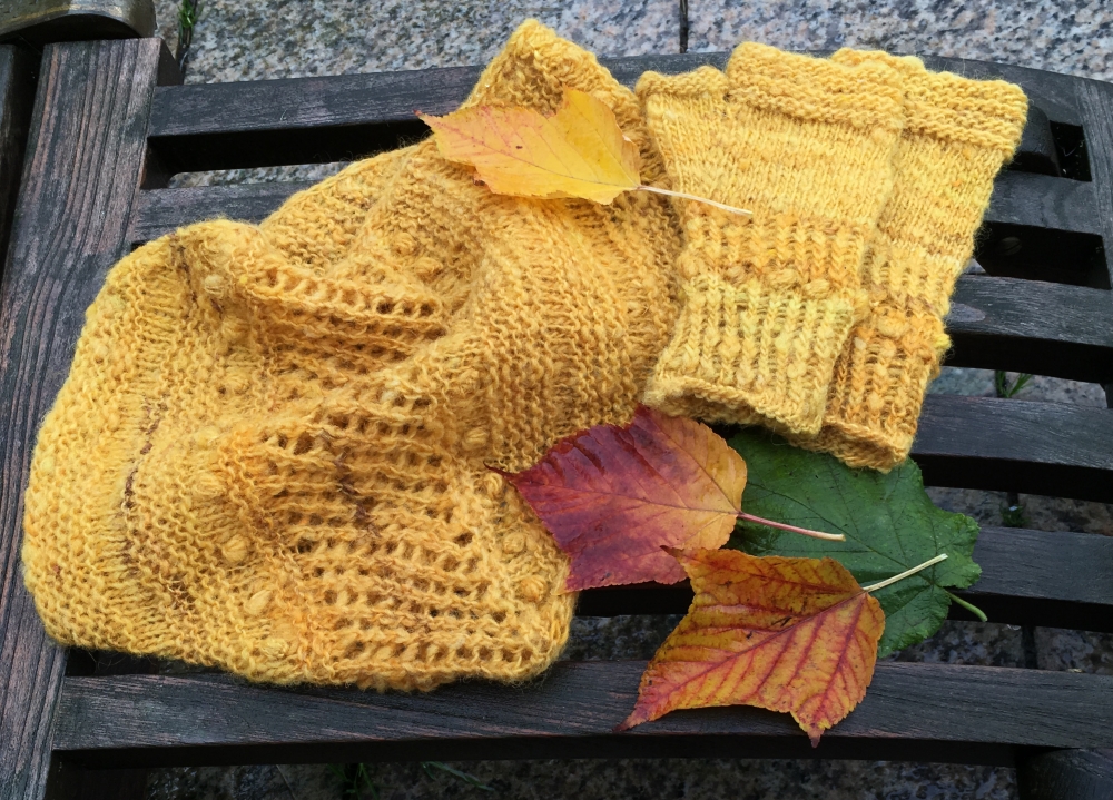 Erst war eigentlich ein leichtes Tuch mit Mustermix geplant aus der wunderschönen, pflanzengefärbten Wolle von Manuela Dreier. Aber dann kam alles anders. Es wäre ja eigentlich auch eine schöne Cowl. Gesagt, getan. Und das war gut so. Es sind auch gleich ein paar Stulpen (NS 3) entstanden (Anschlag 36 M, Bund 1 re verschränkt, 1 li, sonst gleiches Prinzip wie bei den anderen Stulpen. Für den Daumen eine Zunahme mehr)