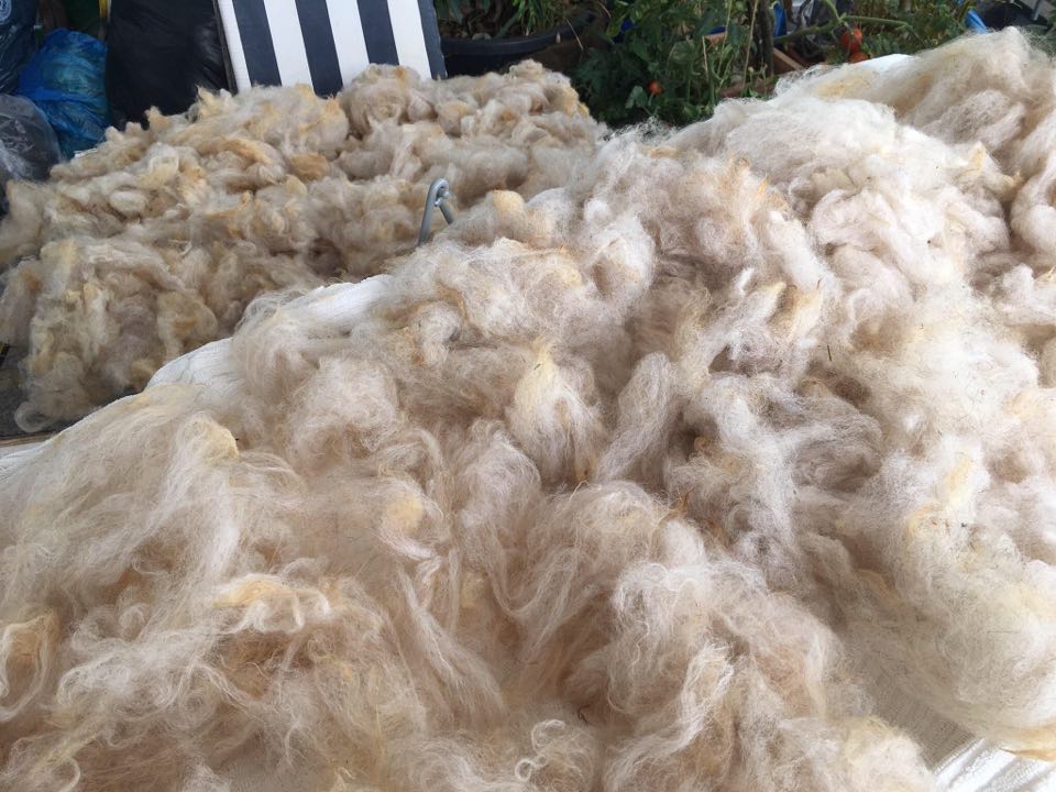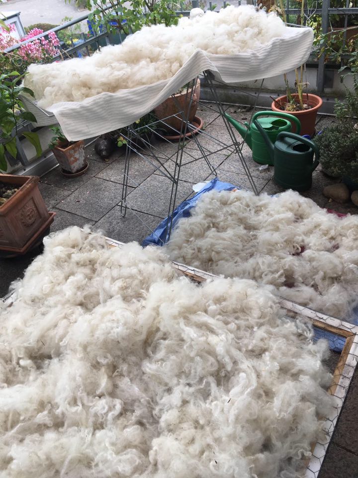 Da ich demnächst mal wieder die Wollkämmerei meines Vertrauens (Godosar in Grünberg) besuchen möchte, um meine Rohwolle professionell kardieren zu lassen, muss jetzt erst einmal jedes Vlies gewaschen und sortiert werden. Frische eingetroffene Vliese z.B. aus Ostfriesland, aber auch noch der ein oder andere Schatz, der schon ein paar Wochen auf eine Wäsche wartet. Es ist wirklich enorm, welche Kapazität ich doch mit meinem 1-Frau-Bad habe. Immerhin habe ich einen sehr großen Balkon, bzw. Dachterasse, wo ich alles zum Trocknen ausbreiten kann. Jedes Vlies wird vor der Wäsche sortiert: Köttel, Nachschnitt und stark verschmutzte, einstreute Teile raus. Das Einweich- und Spülwasser bekommen die Pflanzen. Ich gehe also mit dem Wasser sehr sparsam um. Nach der Wäsche wird die Wolle gut aufgezupft, damit sie besser trocknet und noch einmal sortiert und gesäubert. Auf den Fotos erkennt man gut die grandiose Viefalt. Es ist die Wolle von diesen Schafrassen: Cheviot, Cheviot x Milchschaf x Zwartbles, Coburger Fuchs, Weißkopf-Mix (Deischschaf).