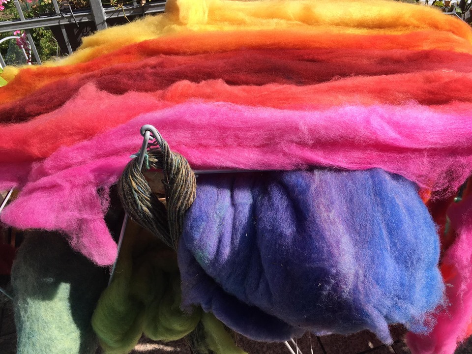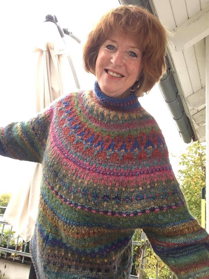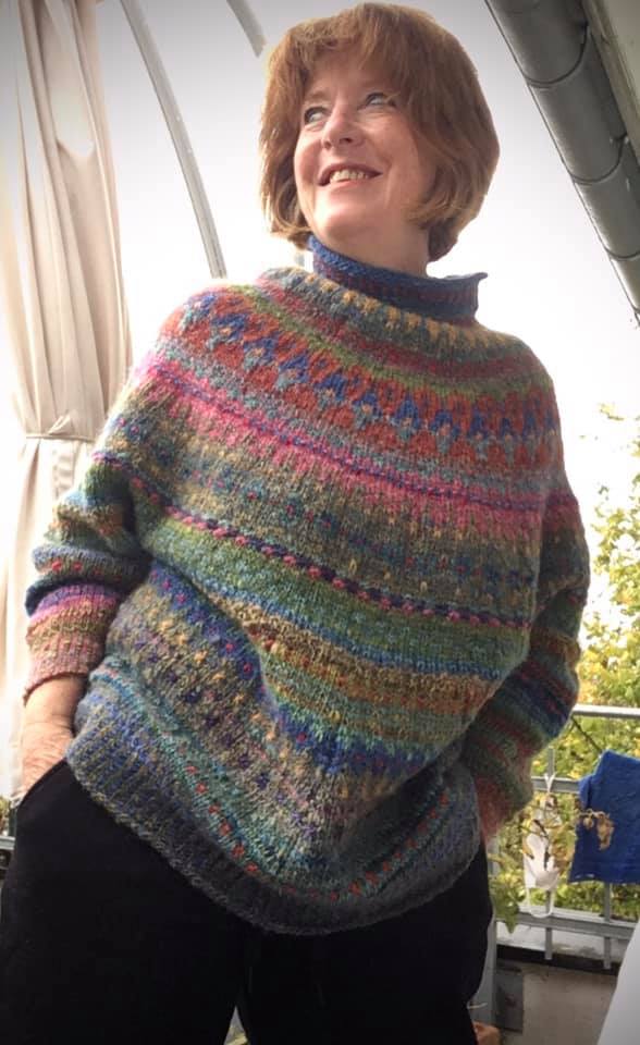 Schon lange ist so Pulli nach eigenen Ideen, Phantasie und Mustern in meinem Kopf gekreist. Jetzt habe ich das endlich realisiert + bin sehr begeistert. Erstmal mußte ganz viel Wolle entsprechend gefärbt, gemischt und gesponnen werden. Eine Rundpasse mit verschiedenen Norweger-Island-Fair-Isle-Mustern sollte sein und die Lässigkeit von dem Swoncho „Arvingen“. Bei einem Raglanpullover (von oben) ergibt sich die notwendige Weite für Schultern und Arme durch 8 Maschenzunahmen jede 2. Reihe, also + 4 M pro Reihe. Bei diesen Mustern nimmt man natürlich nicht in jeder Reihe zu, mal 10, mal 16, mal 20 Maschen, so wie es auch zum, bzw. zwischen die Muster paßt. Also habe ich immer in die Reihen mit den Zunahmen Markierer gesetzt + Strichliste gemacht. + 20 Maschen „reicht“ für die nächsten ca. 5 Reihen. Dann sollte die nächste Zunahme-Reihe folgen. Gleichzeitig sollte die jeweilige Maschenzahl in der ganzen Runde auch zum jeweiligen Mustersatz passen. Also zwischendurch immer wieder gezählt und entsprechend angepaßt. Wichtig: Die Zunahmen müssen sehr gleichmäßig verteilt sein. Da kann man sich aber gut am letzten Muster orientieren. Die Fäden auf der Rückseite habe ich beim Stricken verwebt, so das man nicht daran hängen bleiben kann. Bei ca. 47 cm (ab Halsbündchen Unterkante) habe ich die Ärmel stillgelegt, das ist bei diesem Modell fast schon am Ellenbogen. Den Body habe ich dann wie bei „Arvingen“ gestrickt: alle 6 Runden + 2 M in der Mitte vorne und hinten, gleichzeitig an den Seiten 2 M abgenommen. Dadurch wird das Teil in der Mitte etwas länger als an den Seiten.