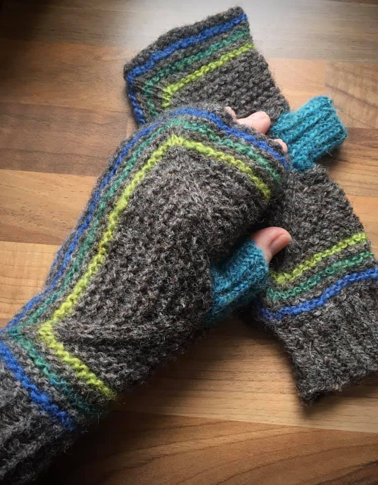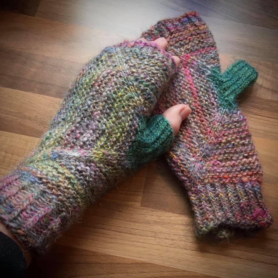 Aus Einzelsträngen und Resten von größeren Strickprojekten kann man herrliche und praktische Handstulpen stricken. Ich glaube, die Idee zu diesen etwas ungewöhnlich aussehenden Stulpen, die man am Daumen beginnt, stammt von Bernd Kestler, einem Strickdesigner, der in Japan lebt. Daher kam auch der Name „Japanische Stulpen“. Nun, ich habe meine ohne Anleitung, und etwas abgewandelt gestrickt. Bei der ersten habe ich noch ein paar Mal geribbelt, aber dann hatte ich den Bogen gut raus. Ich habe sie ein klein wenig zu groß gestrickt, denn ich habe sie nachträglich mit etwas Olivenseife gefilzt. Dadurch wird das Gestrickt etwas dichter und angeflauscht, und natürlich ein wenig kleiner. Trotz der ungewöhnlichen Form passen sie gut. Sie dürften auch weiterziehen, denn ich kann ja jederzeit neue stricken. – natürlich alles handgesponnene Wolle!