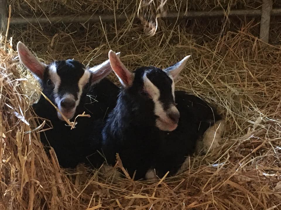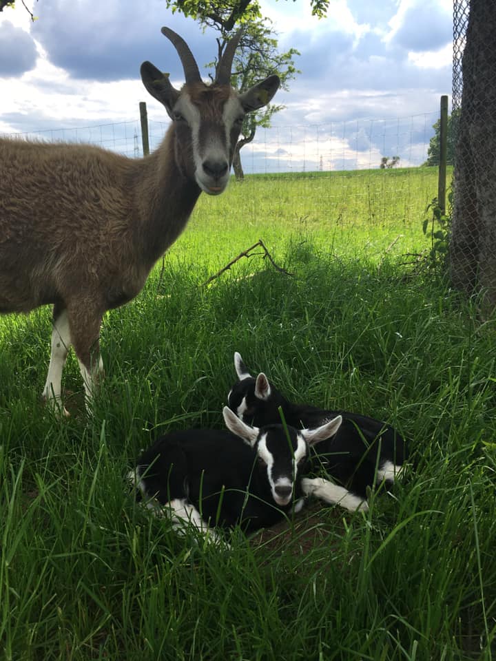 Die ersten 3 Zicklein wurden nun geboren. Nr. 1 ist ein Böckchen, dass den Namen ‚Hennes‘ bekommen hat. Nach ca. 1 Woche bekam er 2 Halbschwestern, die inzwischen auch sehr munter auf der Weide herum hüpfen. Die Zicklein, vor allem Hennes, sind sehr zutraulich.