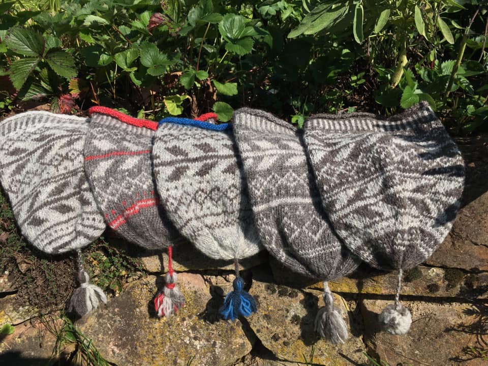 Das rauhwollige pommersche Landschaf bietet so viele unterschiedliche Grautöne: von ganz hell über blaugrau bis dunkelgrau. Das ursprünglich im Norden – an der Ostsee – beheimatete Schaf ist ein sog. Mischwoller und bestens gerüstet für Schietwetter. Angelehnt an die vorpommersche Fischermütze sind einige Mützen entstanden. Und dann wurde auch noch ein reichlich großes Tuch aus ganz heller Pommernwolle endlich fertig. Das war eine echte Geduldsprobe. – Man darf übrigens gerne fragen, ob ich gegen angemessene Anerkennung der handwerklichen Leistung etwas davon abgeben würde.