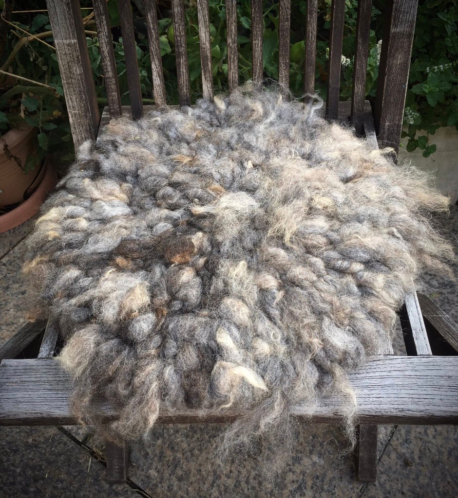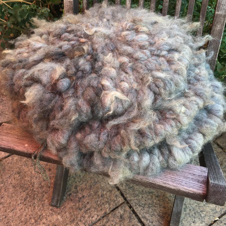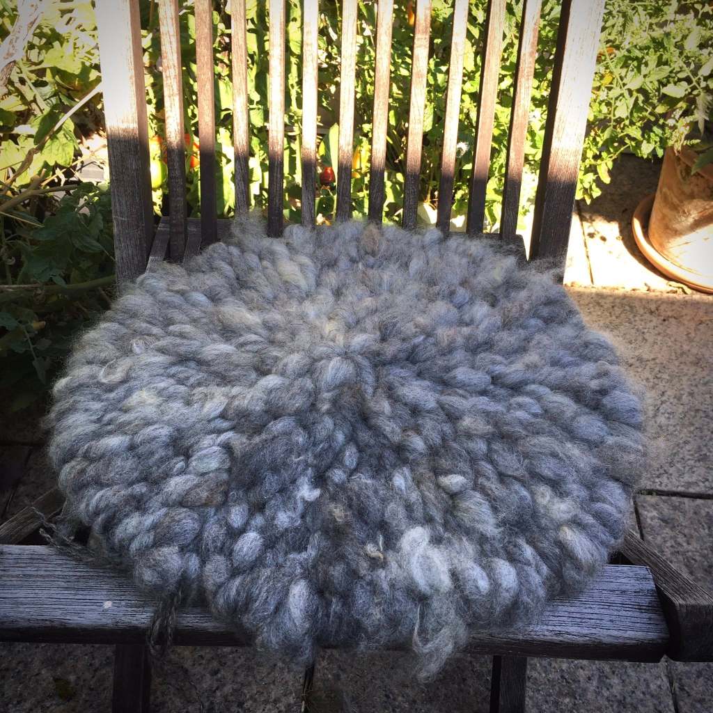 Warm und weich sitzt man auf dieses Sitzkissen aus gewaschener Rohwolle. Ursprünglicher kann es nicht sein. Ich habe die Wolle von unseren eigenen und anderen Schafen, die ich kennenlernen durfte in einer speziellen Technik auf einem sog. Stabwebrahmen gewebt. Der Durchmesser ist ca. 40 cm. Am Wochenende werde sich sie auf dem Apfelweinmarkt zum ersten Mal zeigen