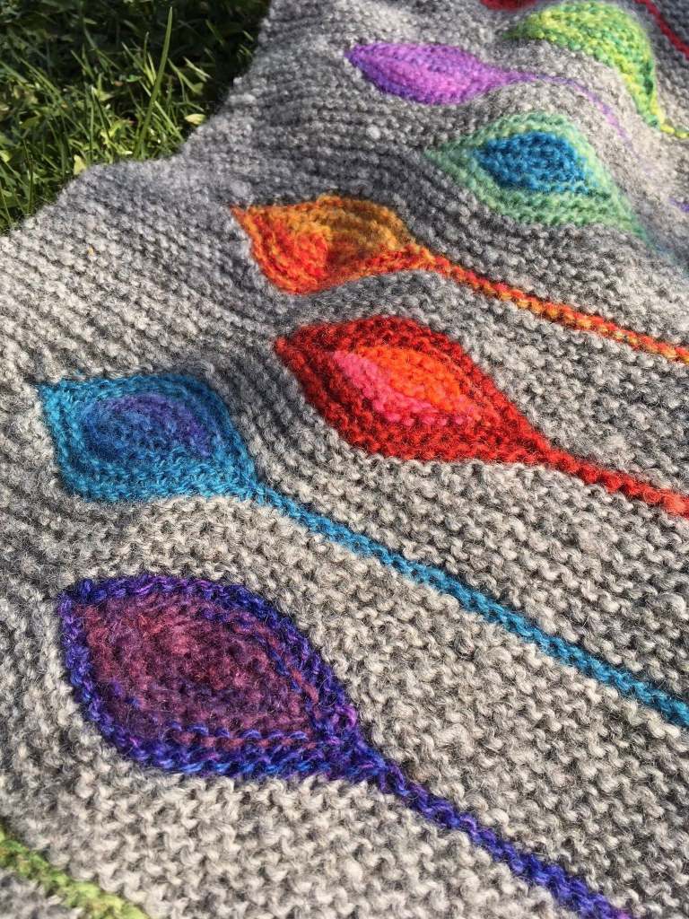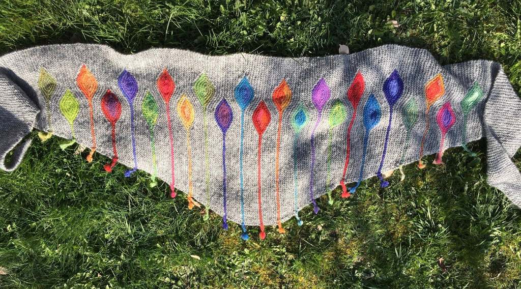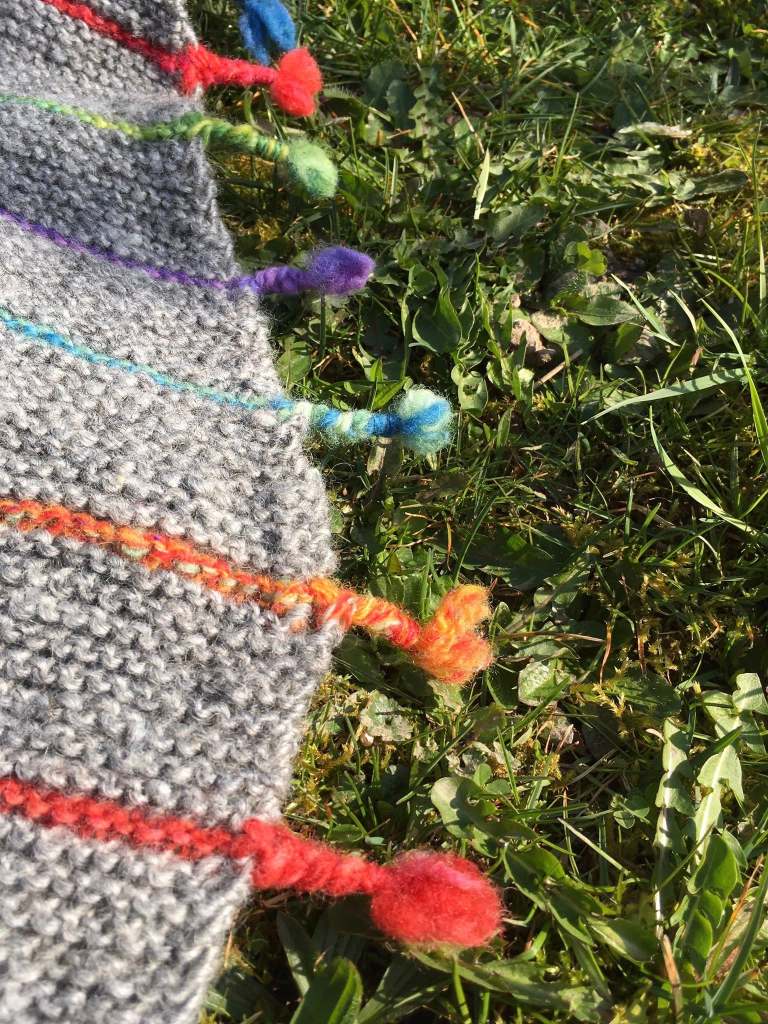 Gestern wurde ein wunderschönes Tuch aus der Wolle unserer Rauhwoller fertig. Rabatt, Design Linnea Ornstein. Ergänzt mit vielen bunten Leftovers. Auf den vorgesehenen Icord habe ich verzichtet. Stattdessen enden die Blätter in kleinen Zöpfen. Ich bin sehr zufrieden. Und nun einige Fotos.